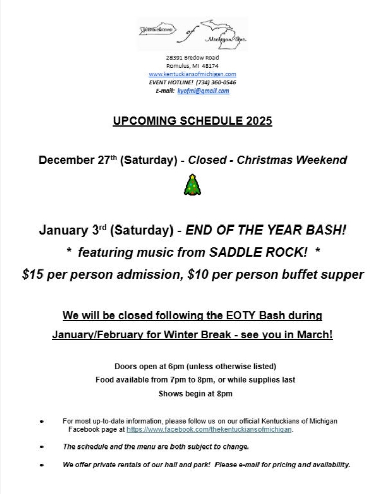 Benefit Jamboree Country and Bluegrass Bands! Include Southern Express, Saddle Rock, John Coffey, Dave Maxwell, Waco, Circle of Fifths and Stone Country. $15 admission, kids free. All day event! Doors open at 1:00 pm, Music from 1:30 to 11:00 pm Hot dogs, burgers, pop and water sold all day, plus dinner may be purchased at 5:00 pm. 50/50, door prizes, etc. BYOB For more details, call the Event Hot LIne. 734-360-0546 |